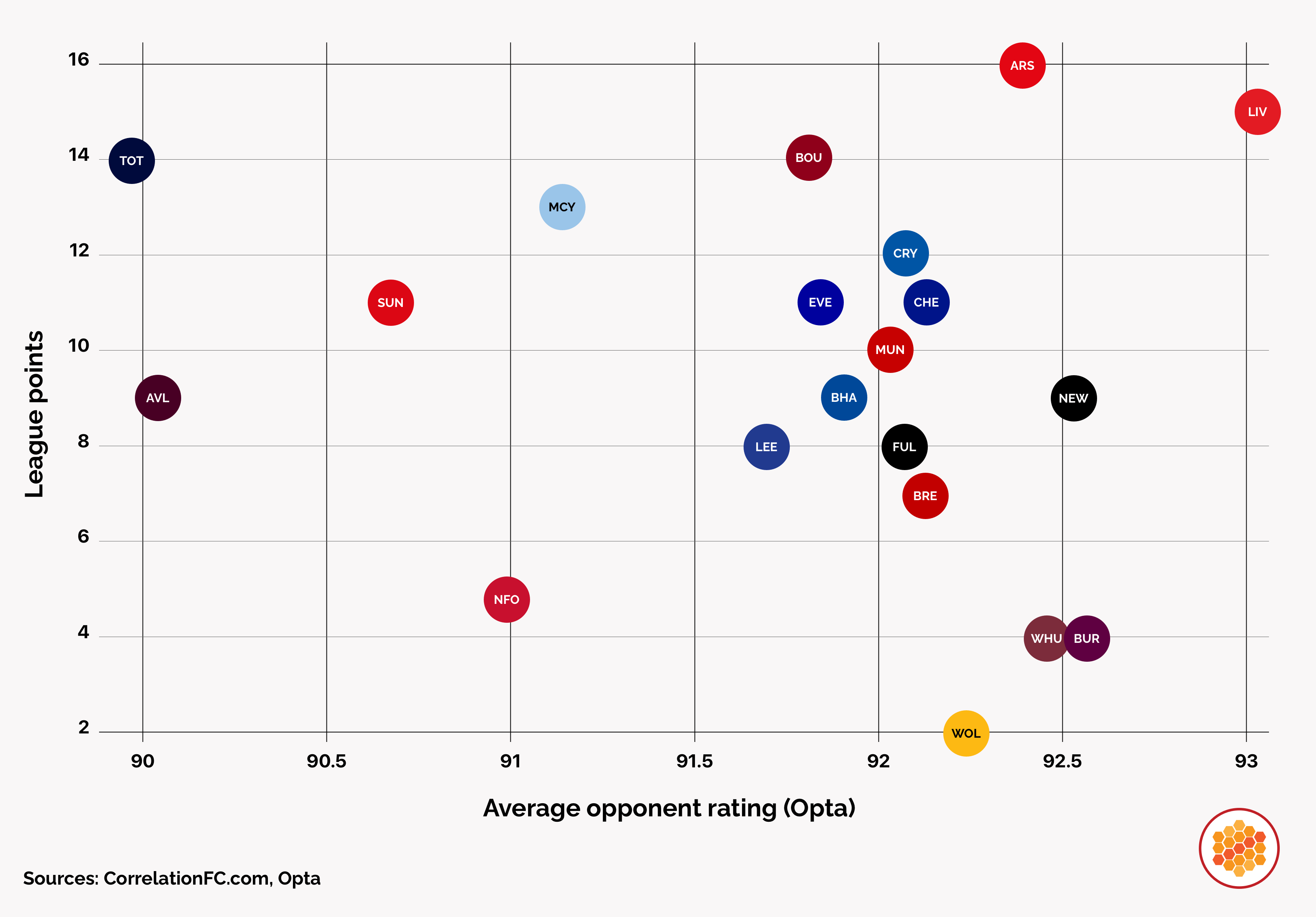 Looking at the graphic, in the top right corner, we can see the teams that have the most points and have faced the most difficult opponents. While Arsenal has one more point, Liverpool has had a more difficult schedule.