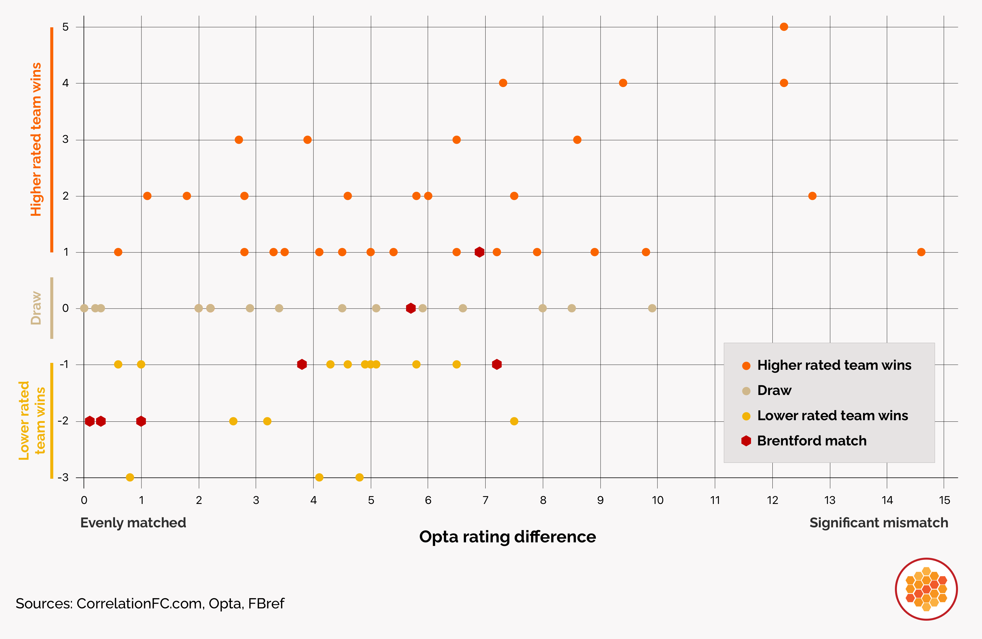 How have the Bees fared? In the bottom left corner, you can see that three of their games were played against similarly ranked opponents, with each ending in 2-goal differences (losses to Forest and Fulham, and a win against United). As you move to the right, you can see Brentford's other performances. The most unusual part of Brentford's results this season is that the higher rated team has only won 1 of the 7 games so far, a win rate of 14%, far below the league average.